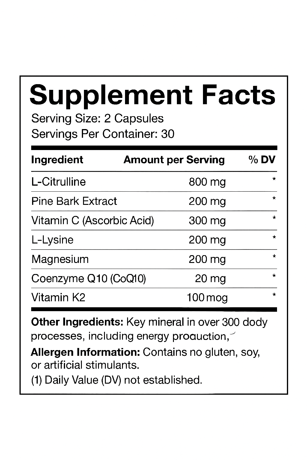 Take 2 capsules daily with a glass of water. For best results, use consistently over several weeks to allow the body to fully absorb the nutrients and restore nitric oxide levels.